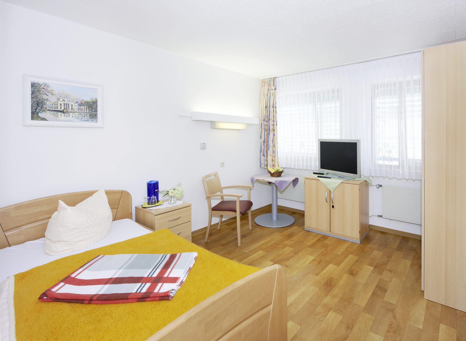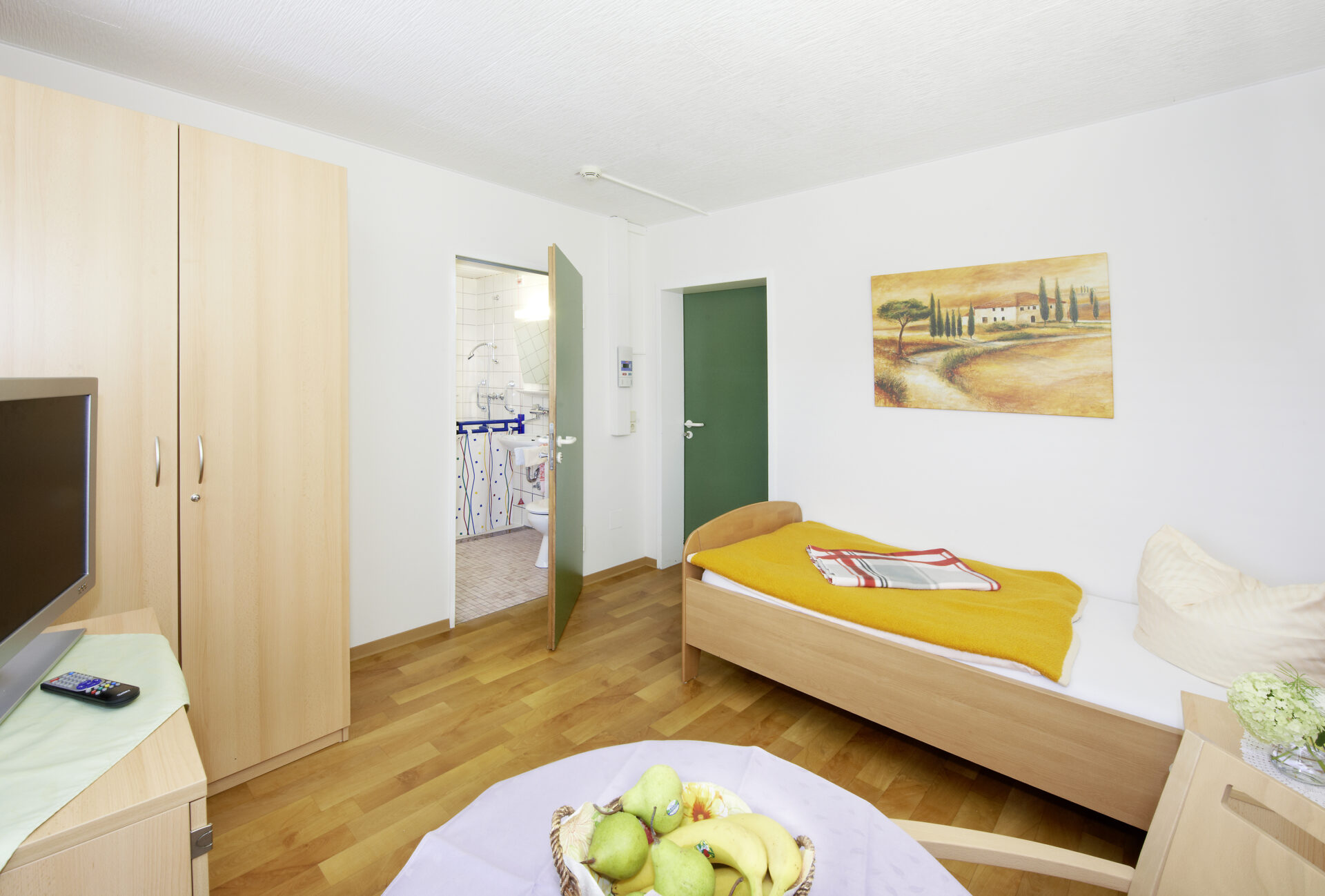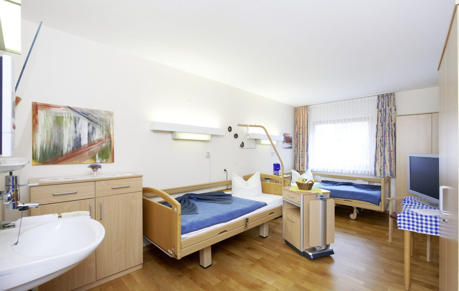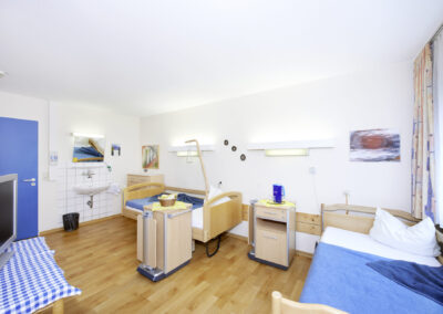 Die Zimmer der Pflegebereiche verfügen zum großen Teil über eine Nasszelle mit Waschbecken/Toilette, teilweise über einen eigenen Sanitärbereich mit Waschbecken, Dusche und Toilette.