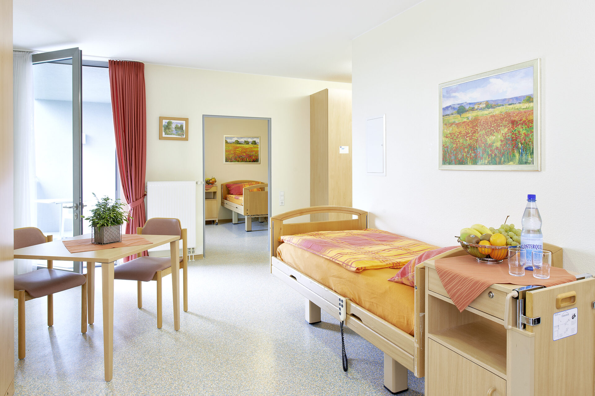 Die Räumlichkeiten bieten die Möglichkeit zum individuellen Wohnen inklusive einer pflegerischen Betreuung. Alle Zimmer der Pflegewohnbereiche sind mit einem behindertengerechten Bad (Dusche/WC/Waschbecken) ausgestattet, wobei in den Appartements zusätzlich eine Kochnische vorhanden ist. Jede Wohneinheit verfügt über eine Notruftaste sowie einen Telefon- und einen Fernsehanschluss.